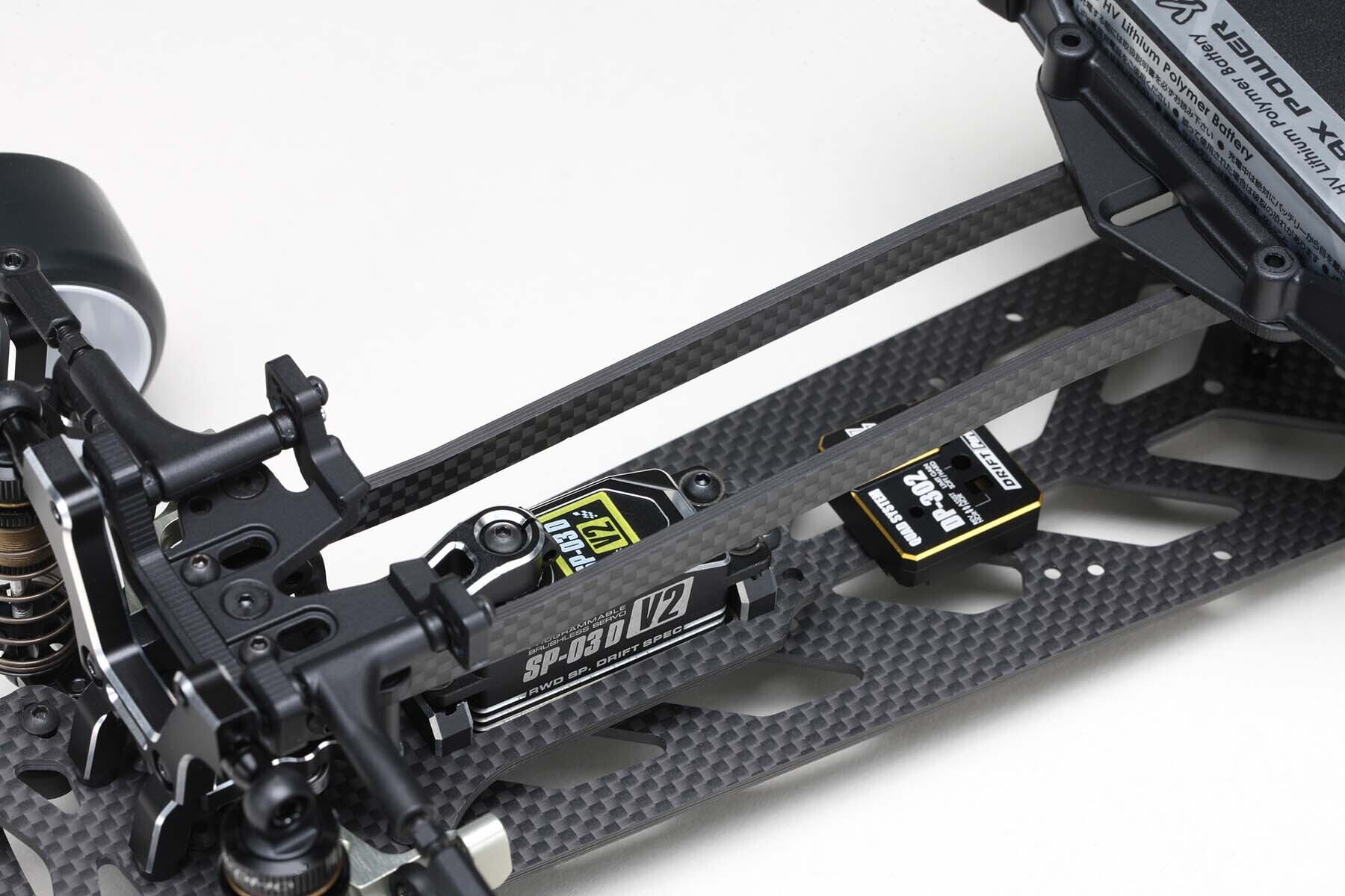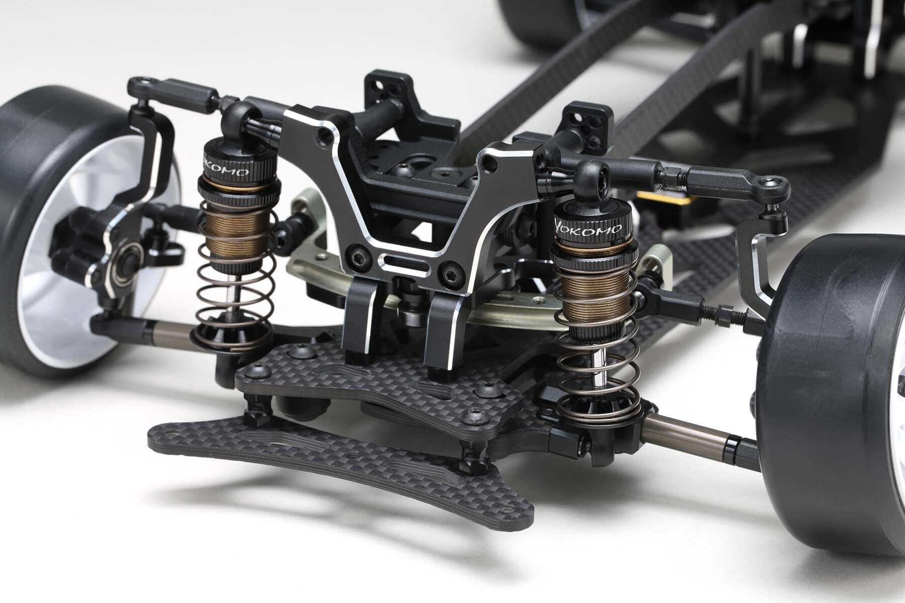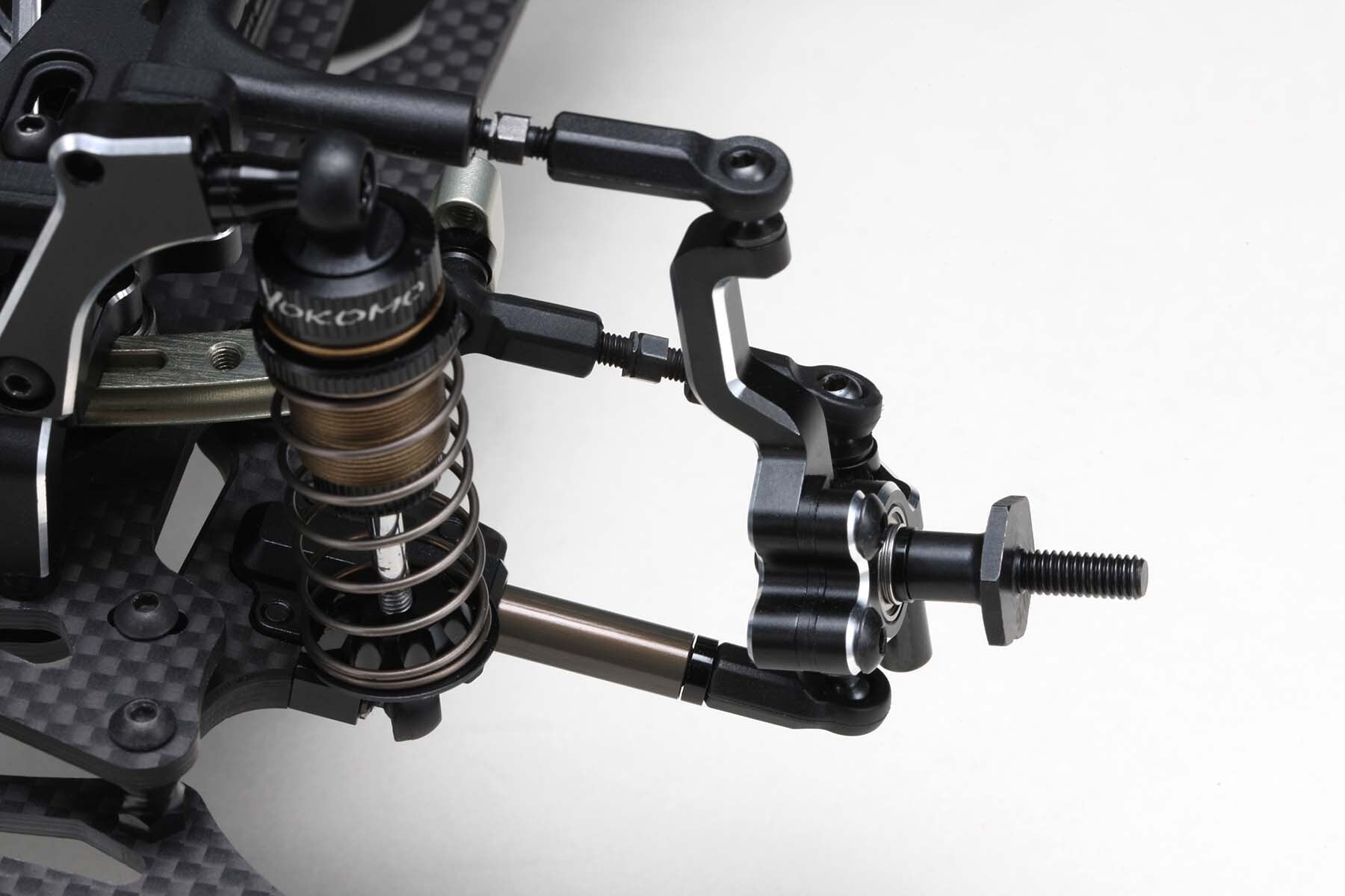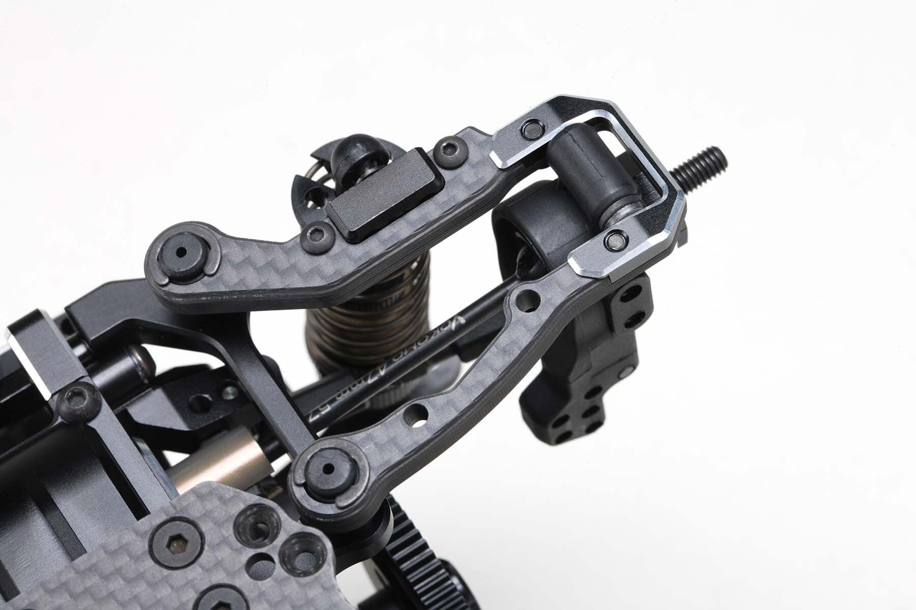 フロントではアッパーアームをハイマウントにしたアルミ製ステアリングブロックが、ロールするマシンで引き起こされがちな過度のノーズダイブを軽減し、適度なアンダーステアの低減とコントロール性を両立しています。キングピンアングルも変更できるので、ステアリングを切った際のキャンバー変化もリアルで、ローアングルでの動画撮影などもさらに楽しくなります。